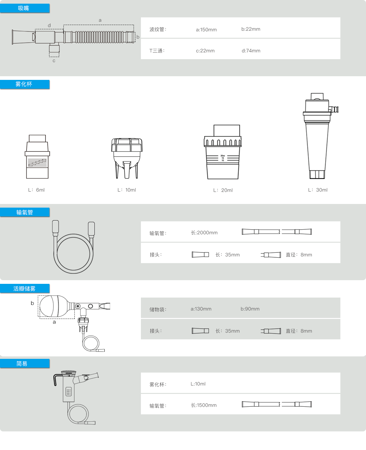 2.產(chǎn)品由輸氧管、霧化杯、霧化吸嘴、波紋管、空氣過濾器、T型三通組成,獨立包裝。